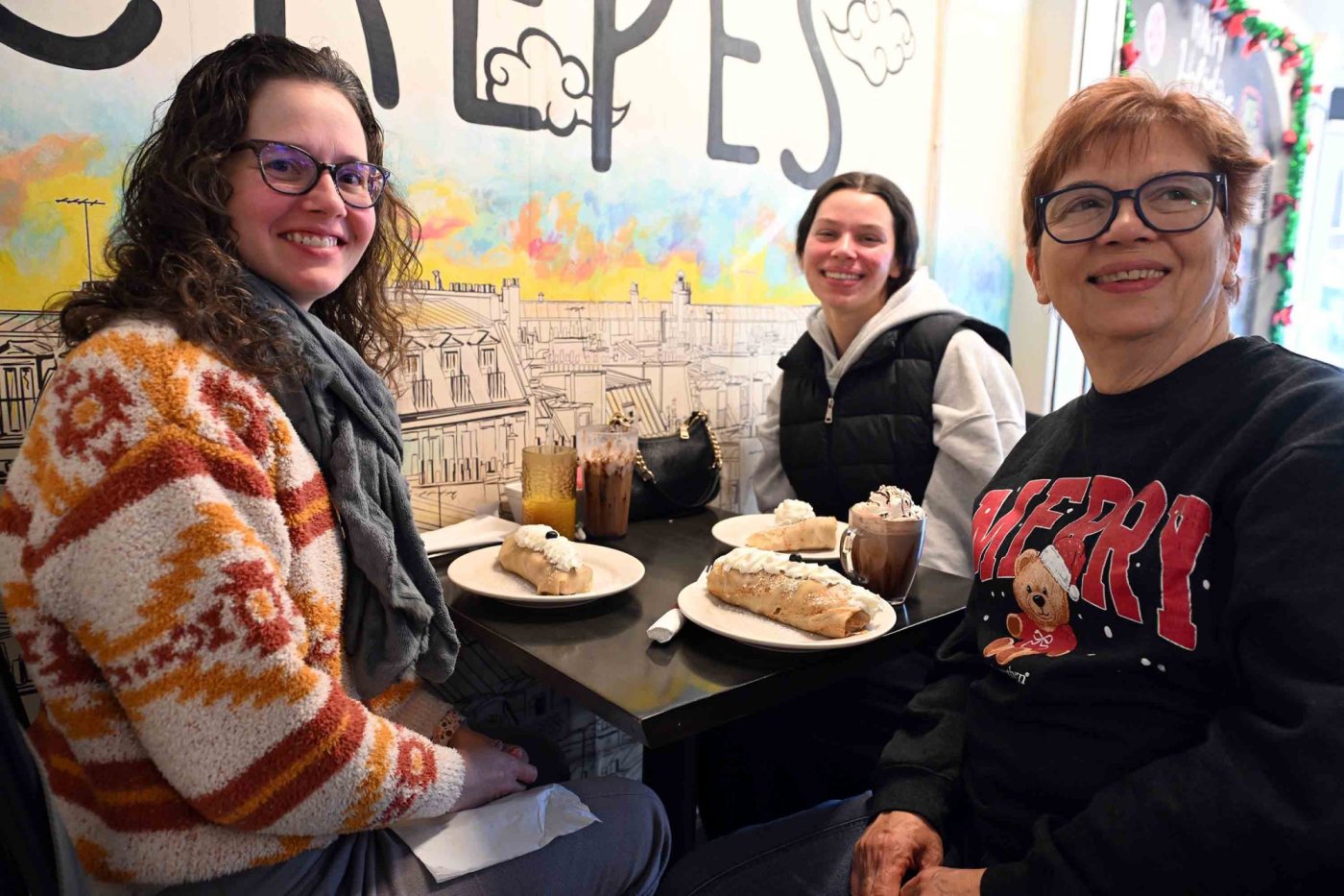 Early shoppers, including three generations of the Henny family, arrived at Taste of Crepes well before the full crowds formed. “It’s the one-on-one,” said Joanne Henny of Muhlenberg Township, emphasizing her preference for personalized shopping experiences over big-box retailers. Her daughter, Michelle Pieller, added, “Online is boring. I like to feel stuff.”